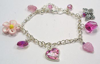 butterfly charm, a handmade polymer clay flower, and a pink abalone heart