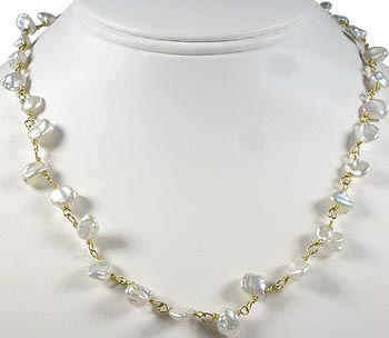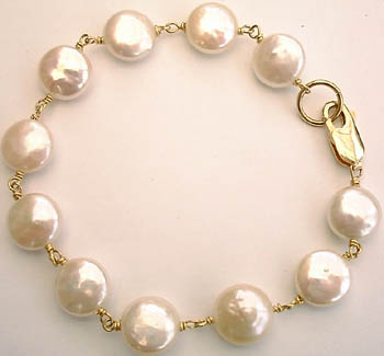 Pearl Luxury Bracelet; A Signature piece which is made with 18 carat gold throughout, with a nice lobster-style clasp, each fine lustrous coin shaped freshwater pearl is wired with 18 carat gold - a very special piece, made to order, this bracelet measures approx. 7½ inches/19.5cm or can be sized upon request (larger sizes may be price adjusted). Special order only; please allow 2-3 weeks for delivery. £165.00 |