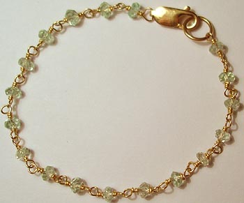 Longing Bracelet; a Signature piece, timeless, dainty and beautiful, I liked this one so much that I had to have one for myself and I wear it constantly - as you wear it it seems to become more beautiful - its light, strong, durable, easy to wear, and made with luscious tiny hand-faceted seawater-shade Aquamarine rondelles and 18 carat gold throughout - the bracelet will fit a wrist up to approx. 6.75 inches/ 17 cm, though if you need something longer please do contact me and we can discuss your requirements. special order only; please allow 2-3 weeks for delivery. £155.00 |