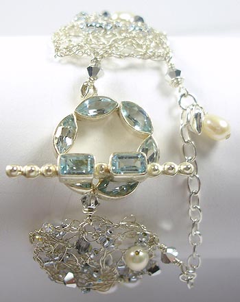 Wedding Day Bracelet; an ultimate piece of jewellery for a bride or for some other special occasion - I have crocheted this cuff using sterling silver with freshwater pearls, Swarovski crystal, and silver lined rocailles; the bracelet is finished with a faceted Blue Topaz and sterling silver clasp, as well as a silver, Swarovski and freshwater pearl safety chain. The bracelet will fit most wrist sizes up to approx. 8 inches/ 20cm. £165.00 This piece is light, airy and comfortable on the wrist. |