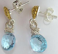 Lovely Earrings; AA quality Swiss Blue Topaz faceted briolettes with hand coiledsterling silver wire with sterling silver and vermeil stud (pierced) earring fittings. Please note, this is a gold and silver mix. Measure approx. ¾ inch/ 2cm. £38.00 sterling silver/vermeil pierced studs. |