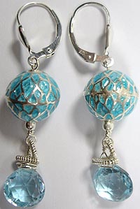 Sky Blue Earrings; enamelled sterling silver beads with AA quality faceted Swiss Blue Topaz drops with coiled sterling round the top of the drops; the leverback fittings shown (for pierced ears) have a heart motif. Measure approx. 1¼ inches/ 3.5cm. £35.00 sterling pierced (leverback) fittings.Option to substitute fittings for -