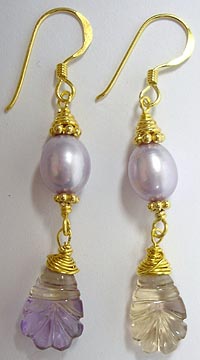 Ametrine Leaf Earrings; carved ametrine leaf drops - one drop is primarily citrine, the other is graduated amethyst citrine with shiny lilac oval freshwater pearls and Vermeil wire and fittings; the earrings have a drop of approx. 1½ inches / 4cm. £32.00 Vermeil pierced (hook-type) fittings. |