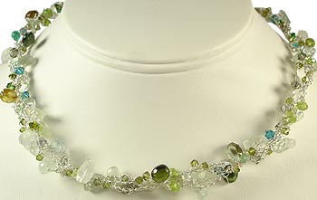 Spring Tide Necklace; a sinuous piece of jewellery with approximately 40 metres of sterling wire, this hand-crocheted necklace features freshwater pearls and Aquamarine, Tourmaline, Peridot, Moonstone and Rock Crystal with Swarovski crystal; it is completed with a sterling box clasp set with a freshwater pearl cabochon. Measures approx. 15¾ inches/ 40cm. £165.00 |