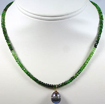 Green Gold Necklace; the beautiful faceted stone in this necklace is Chrome Diopside, a rare mineral from Siberia which is only mined for half the year (as the other half the ground is too frozen to cut into); the difference in the greens is in the amount of Chromium in each bead, hence the name - this is an entirely natural gemstone, which is amazing considering the intensity of the colours. I've added a removable black/peacock freshwater pearl which has a band of Swarovski crystal round its 'belt' and the necklace is strung on Beadalon Pro. The metal used is 9 carat gold - the clasp dates back to the 1930's and is rose gold. Measures approx. 15¾ inches / 40cm. £145.00 |